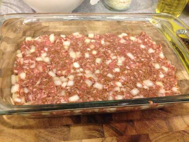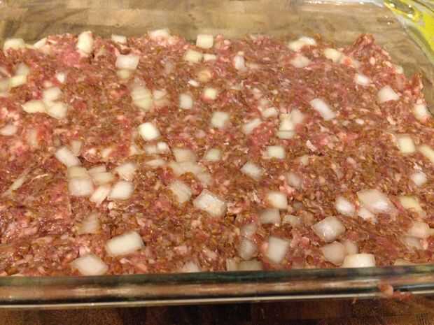 La mitad de la mezcla de Kibbi repartidas en la parte inferior de una fuente para horno enmantecada, utilizar las manos para aplanar la mezcla.