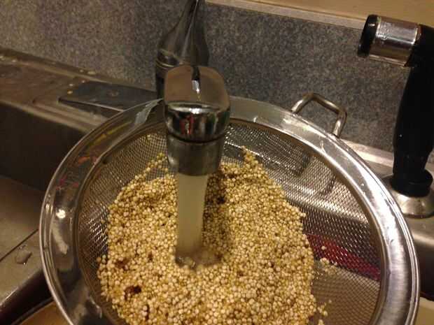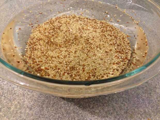Enjuague la quinua roja y blanca, luego combinarlos y remójelos en agua por 15-20 minutos.
