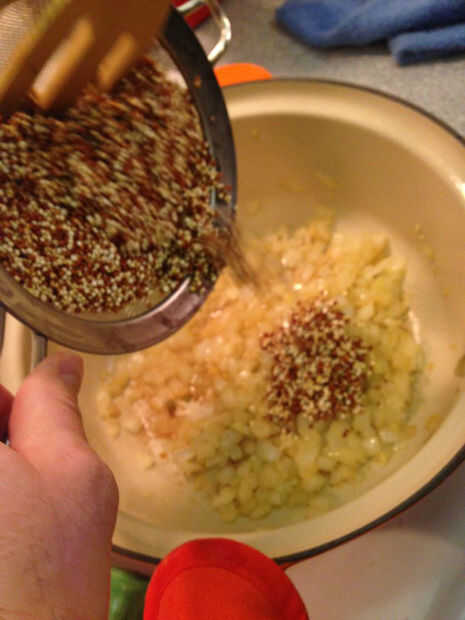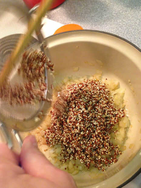 Escurrir la quinua y añadir a la olla. Rehogar durante 2-3 minutos más.