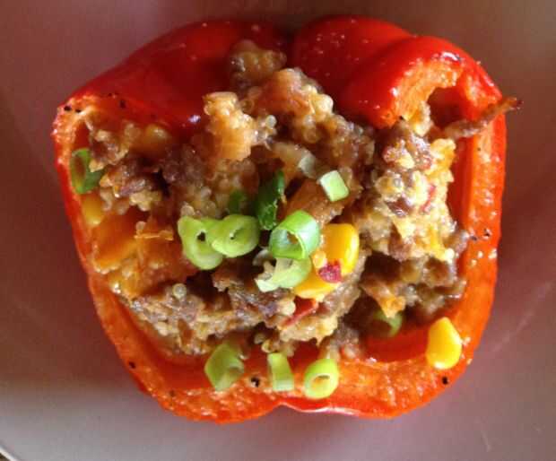 El pimiento debe ser parcialmente asados por ahora, así que los saca y cosas la mezcla de quinoa salchichas en los pimientos.