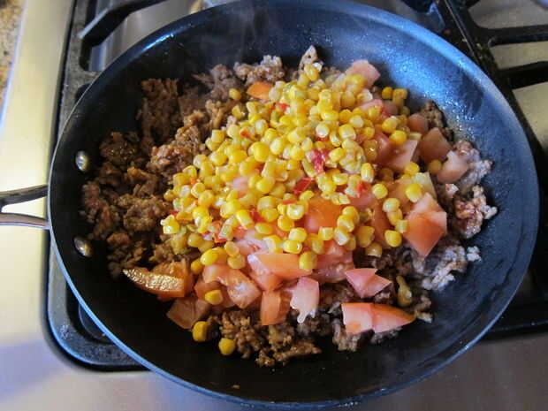 Añadir el tomate picado con las semillas, el maíz de fiesta (que es solo enlatados maíz con pimientos en él). ¿No sé si llama para una fiesta al abrirlo, pero Sírvete una margarita, de todos modos, a la derecha? A menos que sea hora de comer...