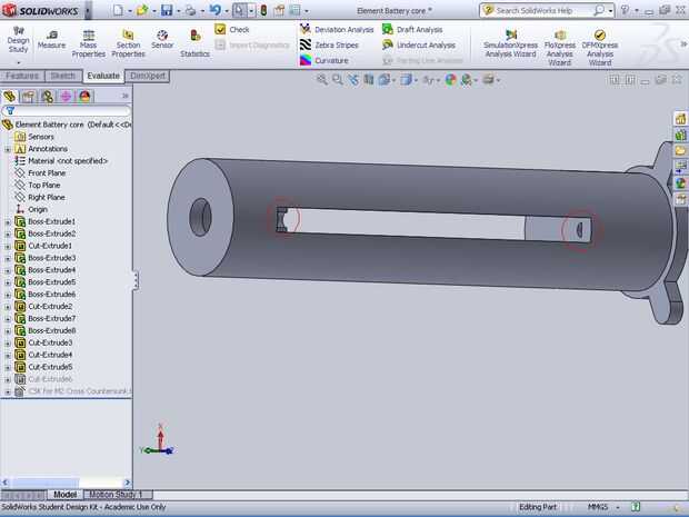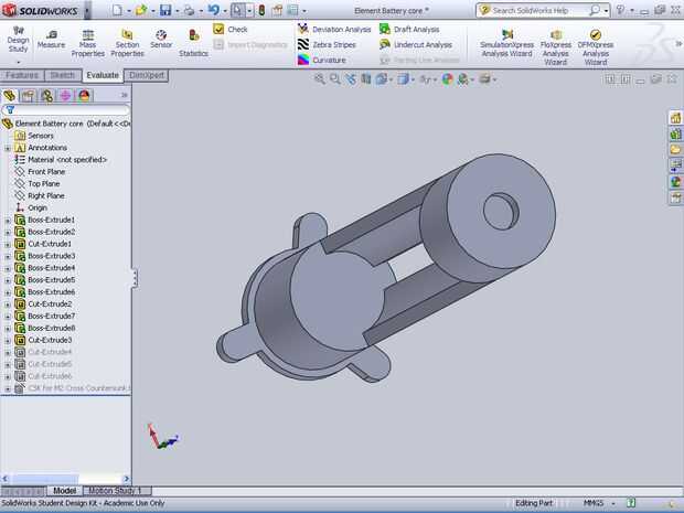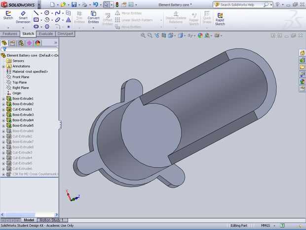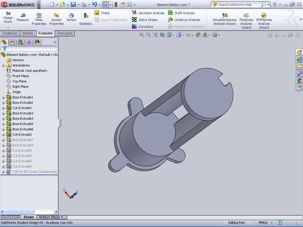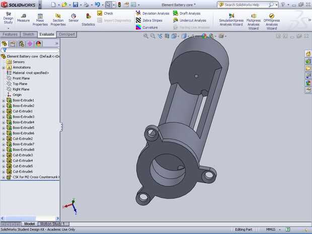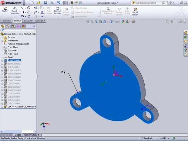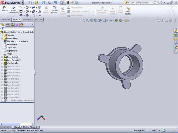 Recrear el bosquejo impar que hiciste en la parte inferior del prisma triangular en una pieza nueva y para sacar a 3mm. Debería verse como imagen 1. Ahora dibujar dos círculo en la parte superior el sólido con 11,5 y 15,5 mm de diámetro. extraer el anillo creado 10mm. Ahora, dibuja un círculo con un diámetro de 10mm en la parte inferior del sólido y para sacar cortado hasta la próxima. Su parte debería verse como la imagen 2. A continuación, cierre el extremo del tubo creado anteriormente. y crear un círculo mitad extruido sobre la superficie plana recién hecha. el modelo debe parecerse ahora a cuadro 3. Ahora, crear un plano circular encima de la previamente creada medio arco 3 mm de espesor. crear un cuadrado en el vértice del arco en la parte superior del modelo y para sacar cortado hasta la parte inferior, creando una jaula de batería. el modelo debe buscar como cuadro 4 crea un anillo y una placa similar a las creadas en los cuadros 2 y 3. Luego corte un agujero a través de la primera capa de la parte superior del modelo. Esto contendrá el LED. el modelo debería parecerse ahora a cuadro 5. Ahora, corte un agujero en forma de un semicírculo en la base de la caja de la batería, creando un camino para el cableado y switch. Crear un agujero de idéntico en la parte superior de la caja de la batería, permitiendo que los alambres de plomo para el LED. Estas características son un círculo en la figura 6. sacar, cortar un agujero minúsculo (1 milímetro de diámetro) en el centro de la parte superior de la jaula de batería hasta la próxima y perfore los agujeros en las lengüetas en la base del modelo. (M2X0.40) su modelo debería verse como la imagen del 7.