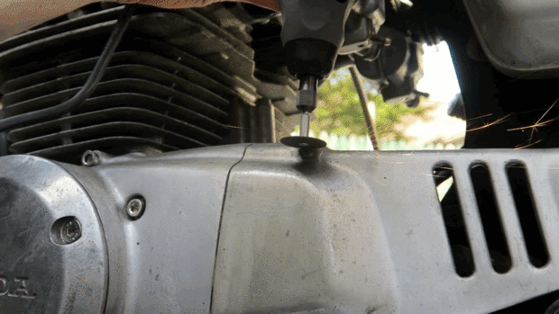 Para trabajar con una cabeza de tornillo pelado, el siguiente paso es cortar una ranura en él con una herramienta giratoria y rueda de corte. Asegúrese de usar protección para los ojos, como las ruedas de corte tienen una tendencia a romper y enviar fragmentos de en todas las direcciones. Sujete la rueda como perpendicular a la cabeza del tornillo como sea posible y cavar cortar una ranura nueva en toda la cabeza. Esto le permite aprovechar mejor.