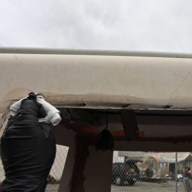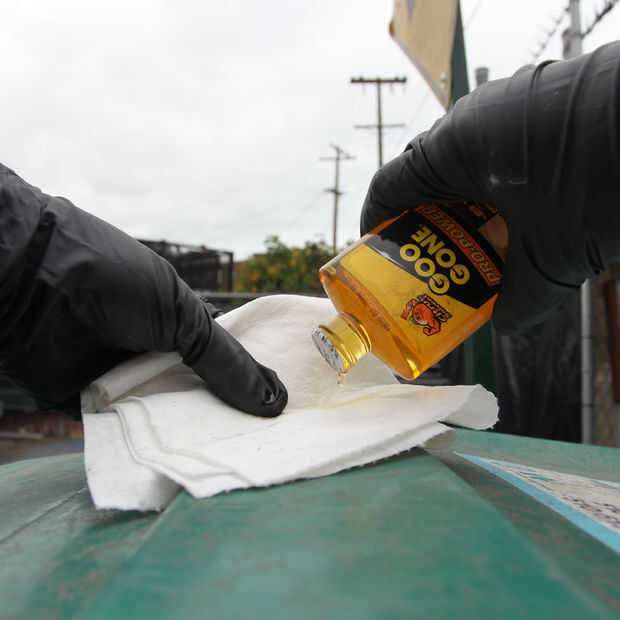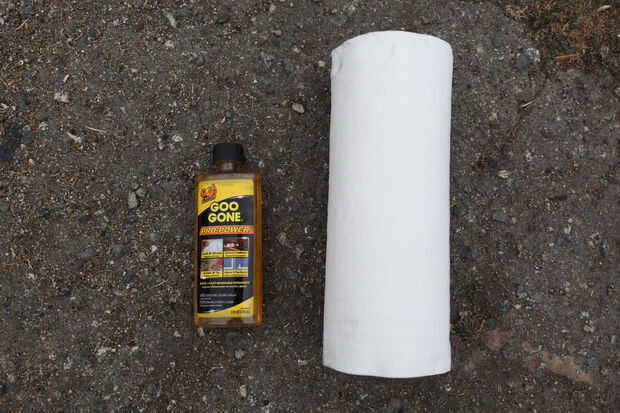 Quité lo que pude con una cuchilla de afeitar y una cuchilla de masilla, pero todavía había una gruesa capa de permanecer del residuo negro y pegajoso. Fui a la tienda y encontrar un producto llamado GooGone. Usar guantes, puse algunos el solvente en una toalla de papel y frota una cantidad abundante en la superficie del casco. Permití el solvente para unos minutos antes de limpiar con otra toalla de papel.