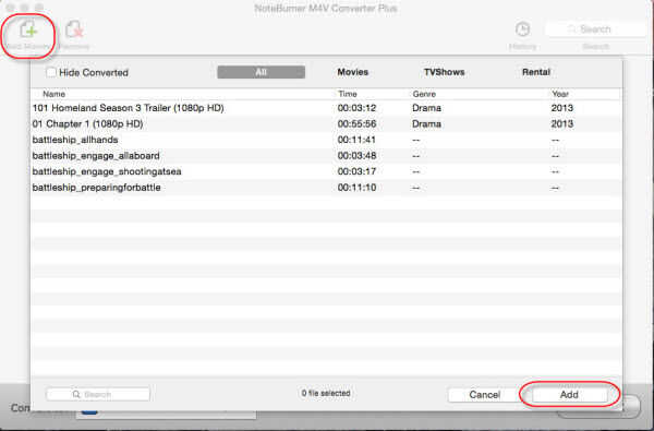 Lanzamiento NoteBurner M4V Converter Plus, haga clic en el botón Añadir películas, entonces usted verá el pop up de windows que le mostrará todas las compras de iTunes y alquiler. Este software de eliminación de DRM de iTunes le permite agregar su video de iTunes desde el catálogo de los medios necesarios tales como películas, programas de televisión, Podcasts, etc..