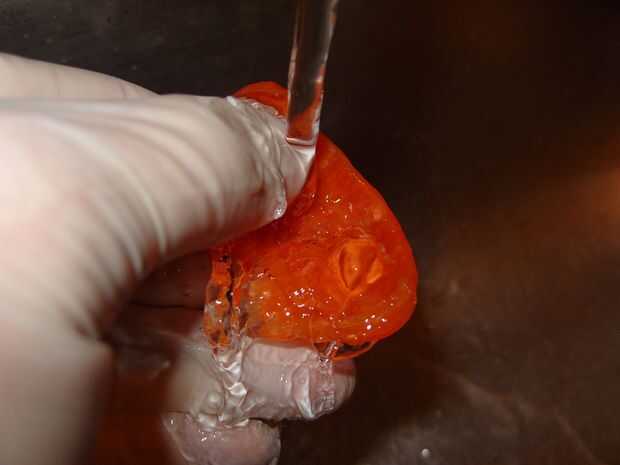 Después de haber raspado lo, enjuague con agua. Este paso realmente no baje mucho la capsaicina y probablemente skipable... pero apenas se siente derecho a aclararlo.