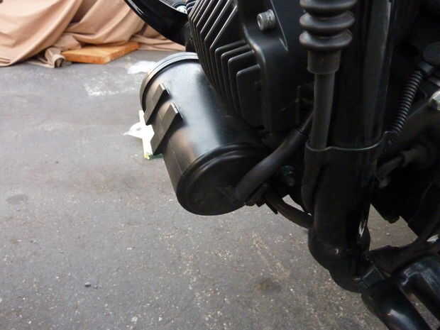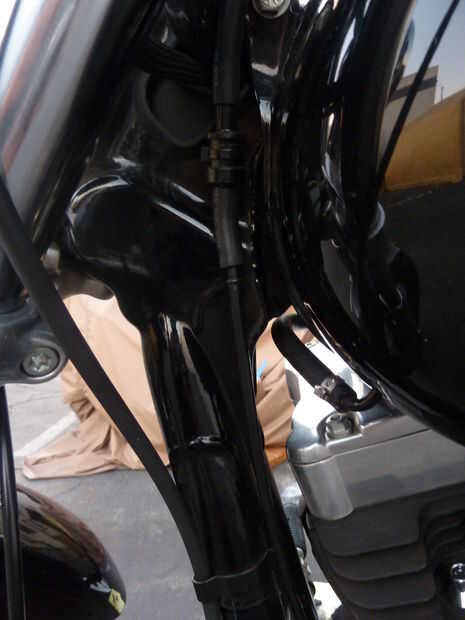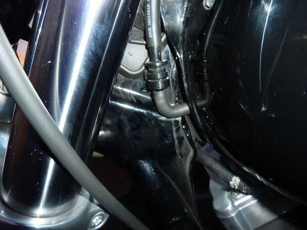 Si fueras a trazar la ruta completa de esta manguera, ves que se conecta a la parte superior de su tanque de gas debajo del clúster. No es necesario quitar toda la longitud de este tubo. En el punto donde la manguera viaja justo frente al tanque, es puente con un conector de goma. Esto es donde nos desconectará de la moto. Una vez más, sólo quitar con pinzas o sus manos.