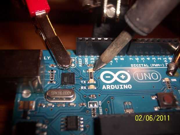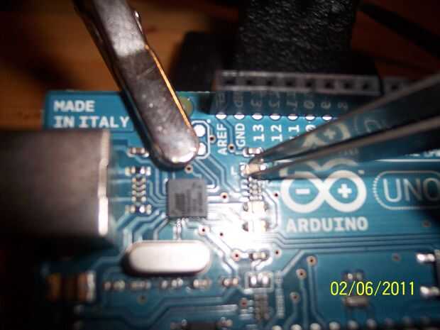 Vamos ahora a aplicar el soldador a un lado del LED, asegurándose que el lado que elegimos es uno con soldadura en él. Una vez que la soldadura se calienta un líquido, nos agarre el LED con la pinza y tirar hacia arriba suavemente. Ahora repita el proceso pero este calor tiempo encima de la soldadura en el otro lado del LED. Calefacción y el LED alternados a los lados un par de veces de elevación deben dar los resultados deseados de un pin13 LED gratis!