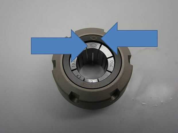 Alinee el laser grabado al agua fuerte diamantes o triángulos (diferentes en varias marcas) sobre la virola y la tuerca del portaherramienta.