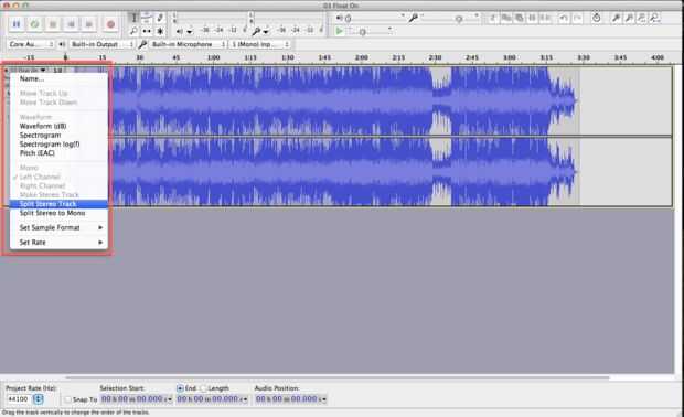 a la parte superior izquierda de la pista de sonido y haga clic en el desplegable de la flecha al lado del nombre de la canción. Haga clic en "Dividir pista estéreo".