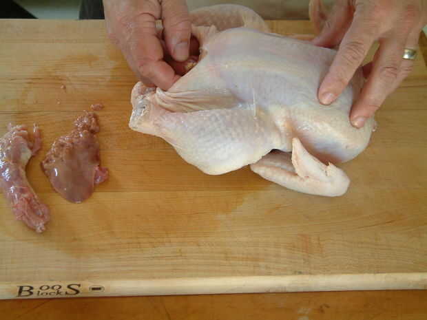 Retire el hígado, corazón, cuello y mollejas de la cavidad del cuerpo y reservar el caldo de pollo. Usted se reserva la poco bits y scraps para stock. No sea un desperdicio, un buen cocinero nunca tira nada. Lave el interior de la cavidad con frío agua corriente y secarlos con toallas de papel. Vamos a conseguir jugando.