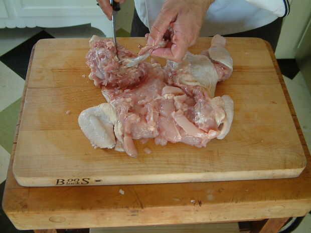 interior del pájaro, cuidadosamente recorte y empujar la carne a lo largo del hueso del muslo hasta alcanzar el muslo. Básicamente toman el hueso del muslo hacia fuera desde dentro de las aves. Separa el hueso del muslo y de quitar. Las baquetas deje intacto, se eliminará después de que su pollo asado.