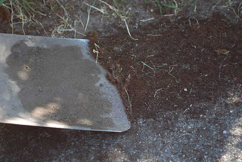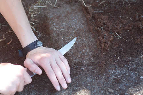 Empezar por deshacerse de las cosas más gruesas, esto es por virtud la parte más fácil para deshacerse de. Usar la pala para deshacerse de la mayor parte de él (esta será ruidosa) y usar el cuchillo para deshacerse de algunas de las cosas más duras y más delgada. Si esto es duro conseguir algo de agua y viértala sobre el musgo, esto debería ayudar a aflojar para arriba.
