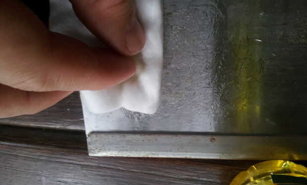 Aceite para cocinar en un disco de algodón y algunos estropajos duros hizo el truco en esta superficie de acero bruto.