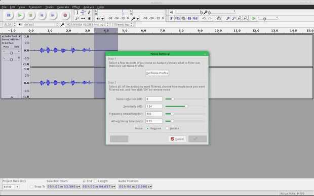 Una vez que tengas el audio en el que desea fijar en Audacity, seleccione un área de su forma de onda audio que tiene ruido a propósito, por ejemplo, si estaba hablando, seleccione un área donde no estaba hablando y los que hay ruido de fondo. El mejor generalmente un área más grande, pero un área bastante pequeña puede hacer el bien así. Luego, con esa área seleccionada, ir a efectos -> eliminación de ruido y haga clic en el botón Obtener Perfil de ruido . Esto conseguirá que el perfil del ruido de fondo que está intentando quitar. Después de este paso, haga clic en la pista y seleccione la cosa entera. Volver a la herramienta de eliminación de ruido y dejar todo por defecto opciones al principio. Generalmente, para mí los valores por defecto bastante bien, pero si la ocasión lo requiere, cambian las opciones para adaptarse a sus circunstancias o para lo que están intentando quitar/lograr con su retiro. Con la pista entera seleccionada, haga clic en "Ok" en la herramienta de eliminación de ruido y eliminará el ruido de fondo de la pista de audio. Si los resultados no trabajan deshacer el paso y volver hacer los pasos con ajustar algunas opciones. Edición de audio feliz! ¡ Disfrute!