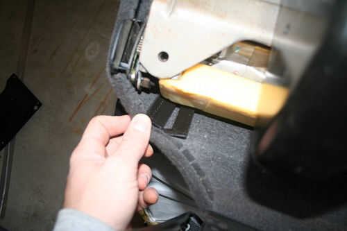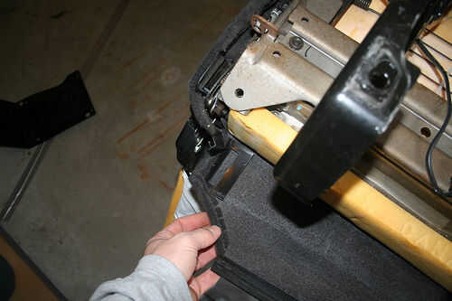Tire de la tela en la parte posterior del sat de nuevo y desenganchar los dos pequeños j-ganchos de conexión de la tela de lado a la tela trasera. Estas son fáciles. No ambos lados.