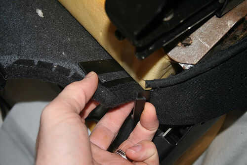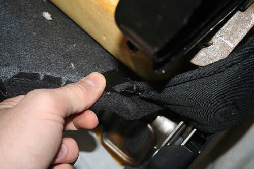 Fije los ganchos de j por detrás a los conectores de plástico duros en la parte posterior del asiento que se envuelve la tela alrededor de los lados del asiento. No ambos lados.