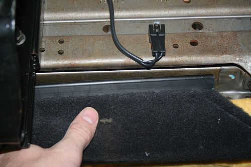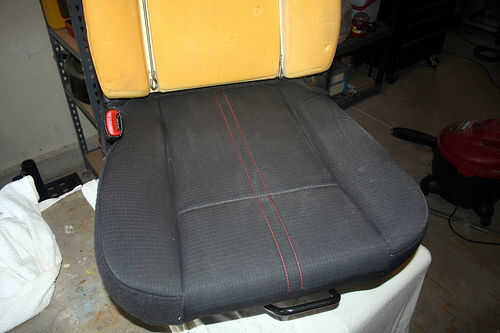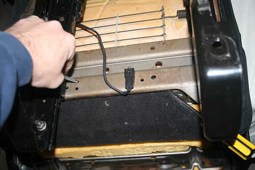 Uso un flathead destornillador y ponlo en el gancho de un lado. Utilice esto para obtener el gancho más allá del punto de conexión. Luego utilice un pequeño destornillador y fuerza el gancho hacia abajo sobre la conexión a través de los orificios en el bastidor. Cuando esto esté en su lugar tienes la parte inferior del asiento terminado!