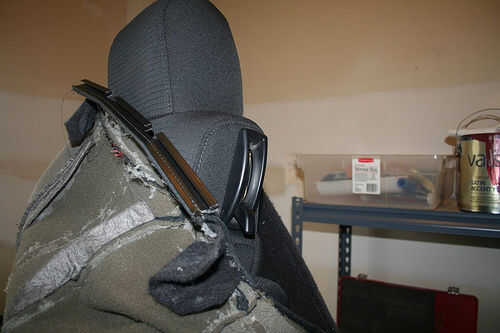 La parte superior del gancho agarrador y vuelta adentro hacia fuera. Tire hacia abajo sobre el asiento. Tire de la tela y el plástico en la carcasa de la palanca. Debería ser más fácil de quitarse.
