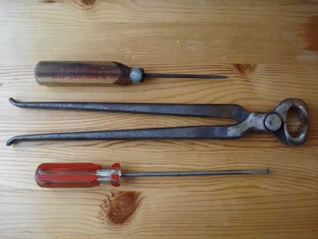 -Un par de pinzas de caballo. Recomiendo mantener un par de ellas alrededor de todo el tiempo. Son básicamente un enorme par de tijeras de uñas de los pies, pero super afilados. (cortadores de alambre resistente también funciona aquí, pero podrían ser un poco más difíciles trabajar con).