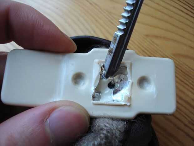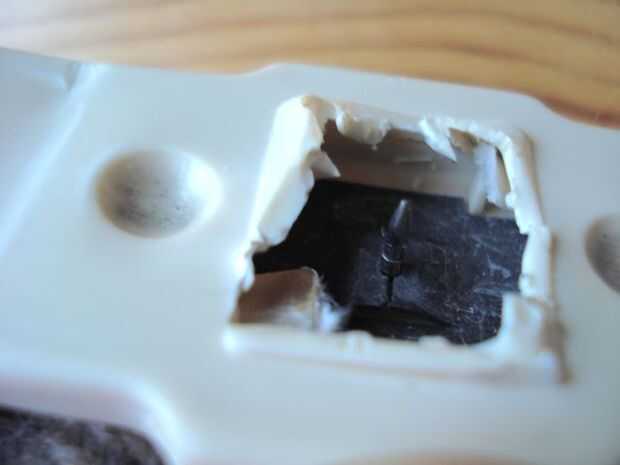 Después de cortar con tijeras la parte trasera de plástico, usted encontrará el culpable señalando a través de una pequeña espiga de metal. Alrededor de ella también encontrará un pedazo brillante de papel. Tome cualquier objeto punzante y chatarra para eliminar esto. Usted necesita acceso directo a lo que está debajo de él.