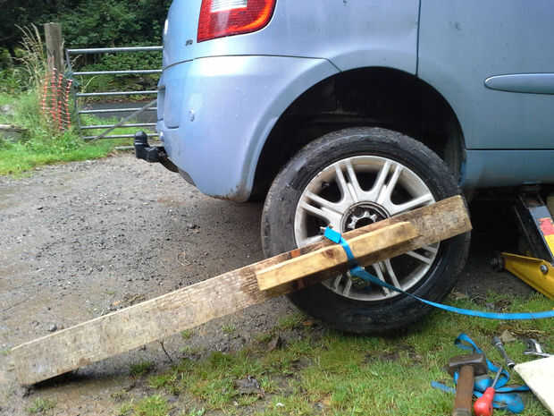 Ahora (suponiendo que haya quitado las tuercas de rueda!) trabajar suavemente la rueda hacia adelante y hacia atrás ligeramente usando la palanca larga de la madera.