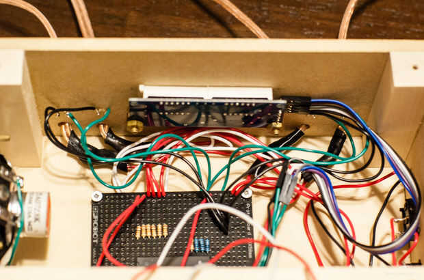 Luego lo he puesto todo en una caja de madera que construí con la ayuda de mi papá, es a la medida para este proyecto y tomó mucho tiempo a la construcción, pero estoy muy contento con el producto final.
