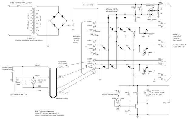 Los relés son descentralizados ya que forman parte del circuito de sistema de pulsador de la lámpara. De esta manera el circuito es más lógico y fácil de construir. Los botones están normalmente cerrados, para que el relé excitado cierre su circuito. Cuando se presiona el botón el relé es lanzado para pasar dos cosas: se abre el circuito del relé de botón, así que si se suelta el botón no ocurre nada (esto asegura la encuesta precisa del empuje instantáneo) y el otro circuito está cerrado encender el indicador luminoso, la señal acústica, y obligando a los otros relés en. Lo último se logra a través de una red de diodos. Por supuesto, las estaciones más desea, lo más complicado es la red. Último pero no menos importante, restablecer e inhiben los interruptores (lógicamente diferentes, eléctricamente la misma) obligará a todos los relés de cierre otra vez sus circuitos hasta que se pulsa un botón rojo grande.