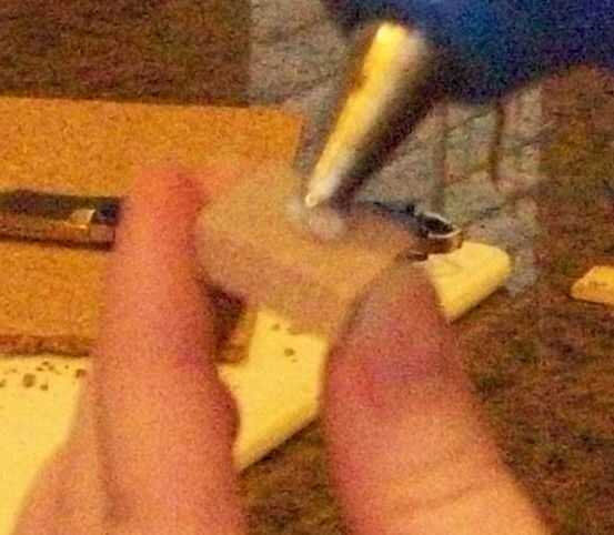 pegamento caliente en la parte posterior. Con cuidado coloque, encolado lateral, en su lugar en el