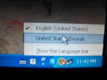 En el menú de datos, asegúrese de que el formato DVORAK está en esta lista. Haga clic en aceptar, luego aceptar de nuevo y cierre el panel de control. En la barra de tareas, haga clic en el botón de teclado y haga clic en DVORAK de la lista.