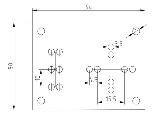 Sobre estas líneas puedes ver el dibujo de mi placa superior. La placa inferior presenta las mismas dimensiones externas y también 4 mm agujeros de diámetro en las esquinas.