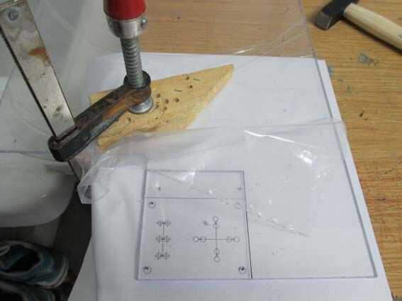 La placa inferior es mucho más fácil de hacer porque no tiene los orificios para los conectores de cocodrilo. Se necesitan sólo cuatro agujeros.