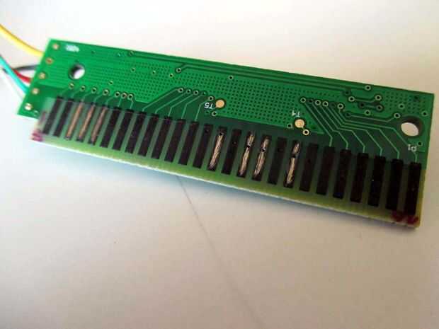 Ahora tenemos que soldar los cables de siete en la parte inferior a la tarjeta de la electrónica del teclado. Para hacer posible, en el teclado actual (ver foto) es necesario raspar una capa de material negro que cubría los pines de cobre.