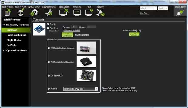Finalmente, usted querrá asegurarse de que la brújula esté configurada correctamente. En la pestaña de configuración inicial, hay una sección de "HARDWARE obligatorio" y debajo de ella, la brújula. Lo único que necesita hacer es asegurarse de que está activada y que la orientación se establece en Manual: ROTATION_YAW_180. Eso es si instalar como lo hice con la flecha a la izquierda del camión.