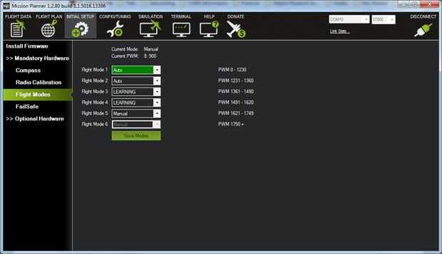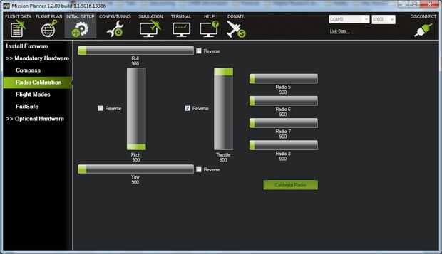 Una vez que se establecen los parámetros, asegúrese de ejecutar la calibración de radio antes de hacer otra cosa y establecer los modos apropiados en el tercer canal en la radio. La calibración de radio está bajo la ficha de configuración inicial hacer seguro su ESC se apaga pero que el receptor y el APM están encendidos desde el BEC externo. Haga clic en "Calibrar la Radio" y luego mover la palanca derecha a todos los extremos y luego mueva el interruptor para el modo de obtener las posiciones de interruptor.