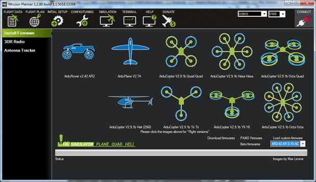 Descargar el archivo MSI de planificador de misión (MP) de http://ardupilot.com/downloads/?category=4 e instalar el programa. Este programa se utilizará para cargar el firmware en la APM y la pantalla principal puede verse en la primera imagen.