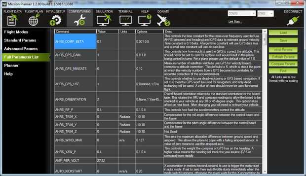Para cargar los parámetros, debe ir a la pestaña CONFIG/TUNING y luego haga clic en la "lista completa de parámetros" en la izquierda. Entonces los botones a la derecha dan una opción para cargar un archivo. Asegúrese de descargar el archivo de parámetros en este paso. Después de descargarlo, debe cambiar la extensión de archivo de .txt a .param. Esto tuvo que hacerse para que se sube a la página web como que no acepta un archivo .param. Una vez cargado, puede leer los parámetros. Una vez has explorado a su contenido de corazones, luego escribir los parámetros en la APM.