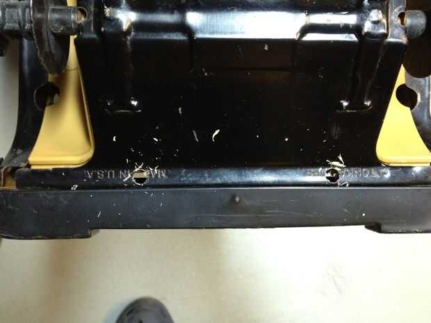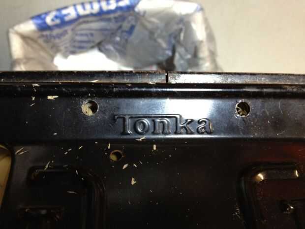 Use el 1/4 broca para perforar en la parte inferior del carro en el frente y la espalda. El frente tiene las palabras "Tonka Corp." y "Hecho en Estados Unidos" estampado en el metal. En el frente, usted querrá asegurarse de que los orificios están en la parte superior de la "C" en "Corp." y en la parte superior de las letras entre la "D" y "E" en "hecho". Centro en el centro de la corta, el lado plano de la zona y debe ser bueno. Las probabilidades de no tiene el texto, debe asegurarse de que el poste de montura se centra correctamente. No utilice un poco más grande que 1/4" porque si utilizas un poco con un diámetro mayor que el ancho del poste de montaje, será flojo.