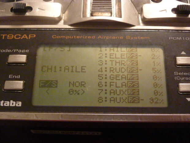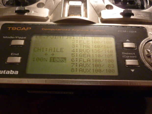 Las dos siguientes imágenes son el punto final y ajuste los ajustes. El punto final solo cambia el recorrido de tus servos. Por ejemplo, el servo de pan de la cámara mueve 45 grados a la izquierda y derecha para un total de 90 grados. Cuando el ajuste de punto final está en 100/100, obtienes el 90 grados izquierda y derecha. Si se reduce el punto final a 50/50, que cambia el movimiento del servo tan sólo viaja 45 grados izquierdas y derecha para un total de 90 grados de movimiento.