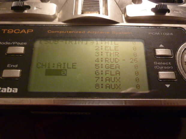 El sub-trim es sutil. Los interruptores de ajuste de la radio le permiten cambiar la moldura como fly/drive. Por lo general, si requiere más de un par de clics de ajuste, entonces lo que hacen es ver donde el cuerno y el brazo del servo, ocupa el guarnecido de nuevo a 0 y luego sacar el brazo de cuerno y probar y manualmente ponerlo donde debe estar. Una vez que esté lo más cerca posible, luego ajustas el sub-trim por lo que es donde debe estar. Luego tienes gama ajuste completo y debe estar en 0 trim.
