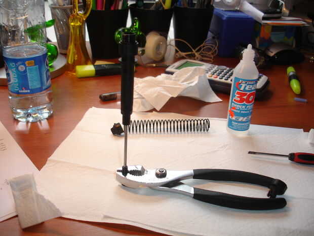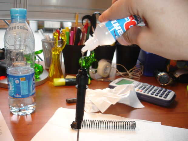 Ampliar el pistón hacia fuera y luego llenar el choque con el fluido de descarga. No llenarla hasta el borde pues como se desplaza el pistón se mueve hacia arriba de la barra de pistón de aceite hay que sobre flujo.