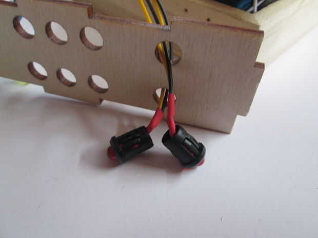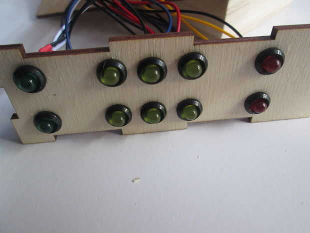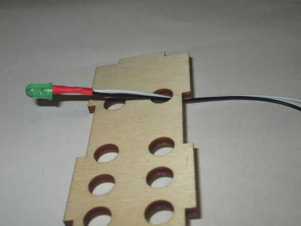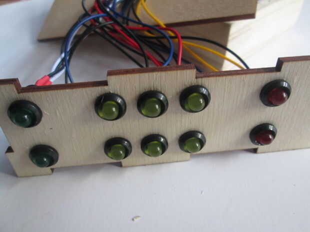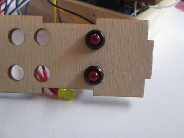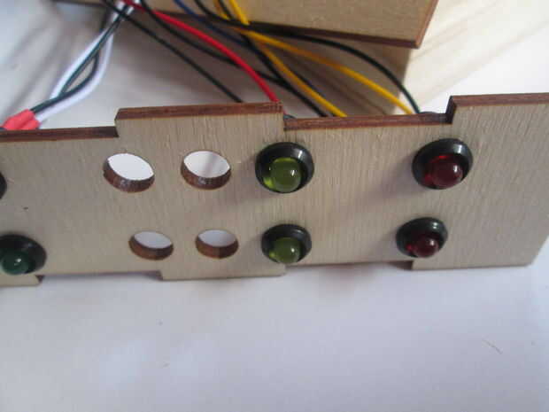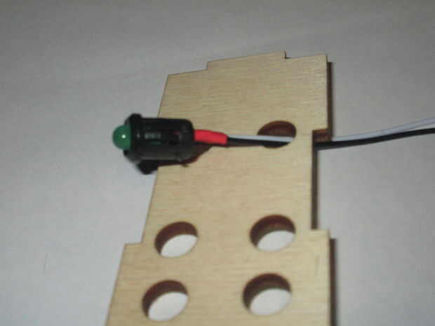 Inserte el LED a través de la abertura de la Junta, y luego instale el bisel del LED. Ahora empuje el LED hacia atrás en su lugar. véase el cuadro 1 a 9. He instalado las luces rojas en la parte inferior, tres luces de amarillo y verde se ilumina en la parte superior. se puede cambiar como usted tiene gusto.