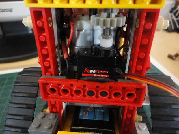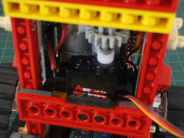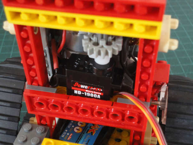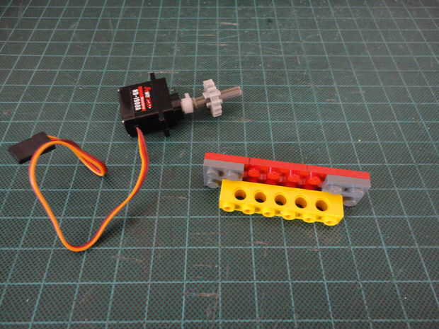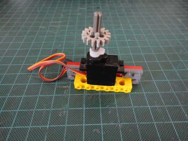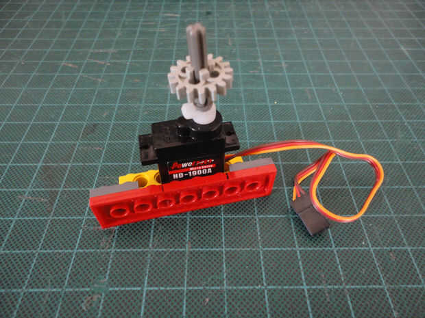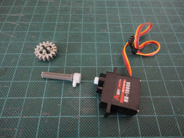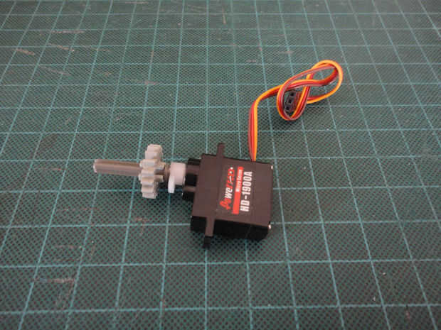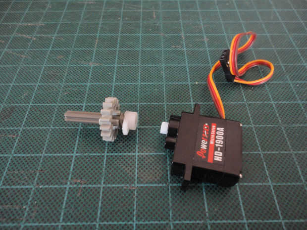 Engranaje de 16 dientes foto 6, 7, 8 (#4019), cuerno del Servo pegado al árbol del 3 L con la perilla (#6587) y Micro Servo de 9 g