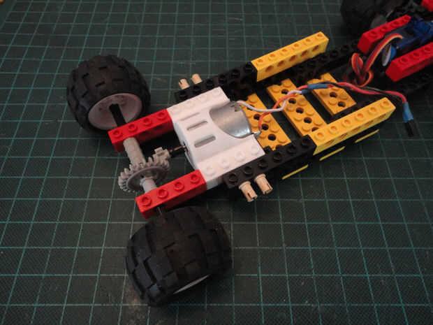 - Se puede construir sin los amortiguadores de choque como una alternativa, por lo que el chasis es paralelo al nivel del suelo. Con esta modificación, el motor puede montarse usando los agujeros laterales en los conectores y motor caja a montar a los ladrillos LEGO (Foto 5, o ver paso 11 instalación de detalles)