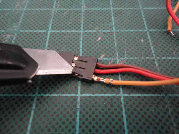 Foto 15, 16, 17 En el otro extremo del conector, usé la punta de cuchillo x-acto para abrir la cerradura, luego saque el puente naranja.
