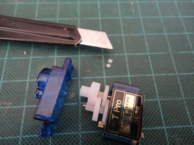 Fotos 10, 11 Busque la ranura debajo de la velocidad superior. Usé cuchillo x-acto para cortar estas dos muescas de la marcha superior para hacer el engranaje superior 360 grados rotativo.