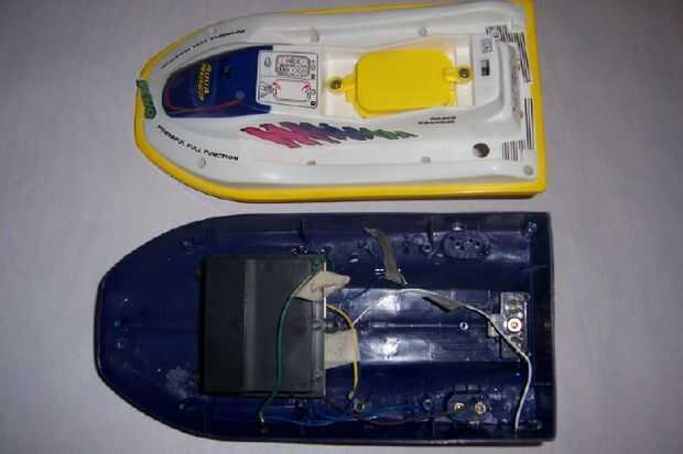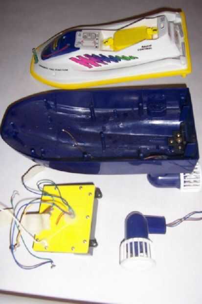 Quitando los tornillos en la parte superior de la cubierta se separa la cubierta y casco en la moto de agua. Las cabezas de los tornillos se ocultan con tapones de goma que levante solo. Dentro es una caja de radio que se fija a la parte inferior del casco, un manojo de cables de colores y los tornillos que sujetan los motores. Corte los cables a la caja de la batería en el asiento de la tapa superior, deje los cables largos. Usted tendrá que cortar los cables en algunos lugares para retirar los motores dejan ellos de largo en los motores, por lo que puede ser resoldered más adelante. Puse un trozo de cinta adhesiva en cada alambre a la etiqueta donde fueron. Desatornille los motores, radio, antena y/interruptor. Guarde los tornillos, puede utilizarlos para volver a montar todo en el pato.