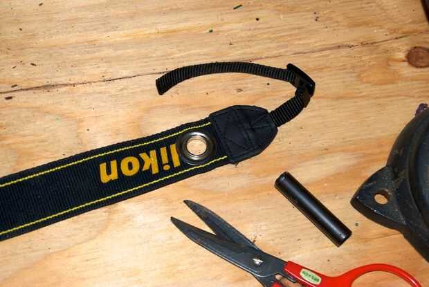 Aviso que es una conexión de cuero cosida entre la trampa flaca y el gordo correa. Se corte la parte de correa grasa aproximadamente 1 1/4 pulgada lejos el conector de cuero. Te corte la correa delgada aproximadamente 5 3/4 pulgadas del conector de cuero.