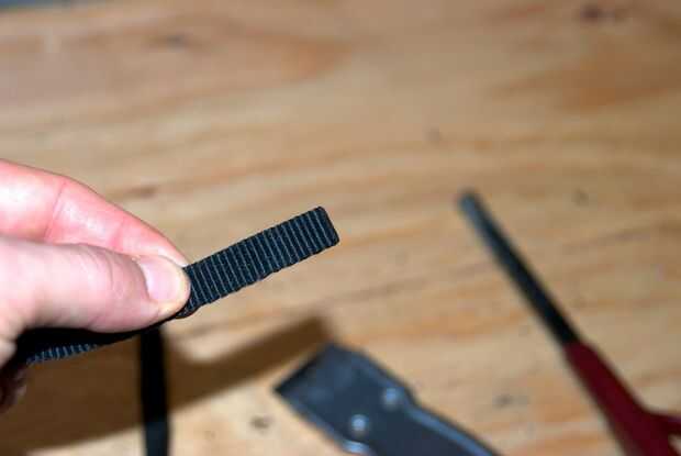 Usted necesitará "cauterizar" el corte por lo que el nylon no fray. Una manera de hacer esto es el corte con tijeras y luego derretir con un mechero. Otra forma es calentar un cuchillo (o navaja) con un mechero, y cortar con la cuchilla caliente. Esto cauteriza el corte ir y parece muy limpio.