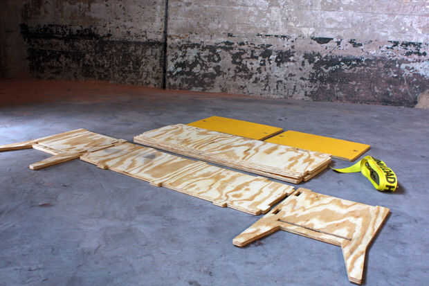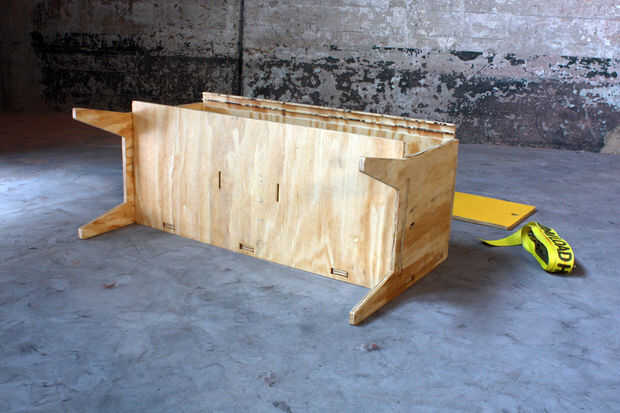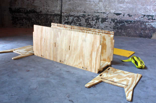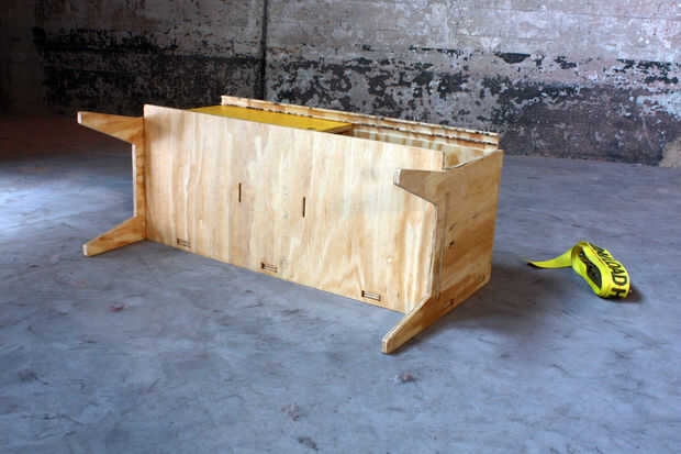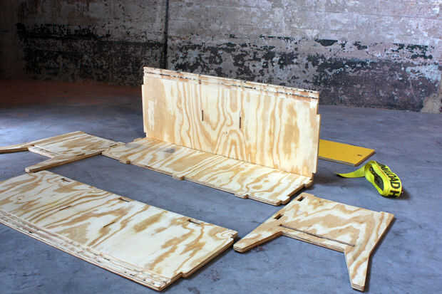 Existen siete piezas. La pieza larga con 10 espigas es la parte de atrás. Inserte las espigas en cada extremo en las mortajas correspondientes en cada pieza lateral.